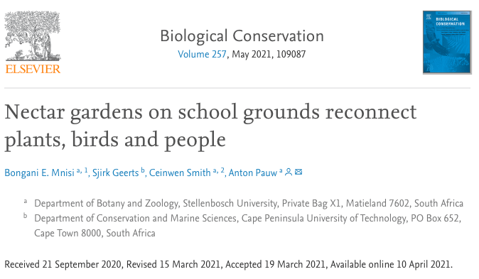 Ingcungcu recently published the scientific paper ‘Nectar gardens on school grounds reconnect plants, birds and people’ in the journal Biological Conservation. Using seven years of monthly bird monitoring data collected at eight Ingcungcu school gardens, the paper measures the impact of planting nectar-rich gardens on the presence of sunbirds and the knowledge increase in learners.